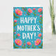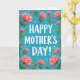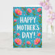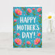 This card features a large, affectionate “HAPPY MOTHER’S DAY!” centered on the front in bright white, with a soft shadow that gives the letters a gentle lift. Behind the message, a calm turquoise background sets a fresh, airy scene that feels like a sunny morning 🌼. Flowers surround the text from all sides, as if they’re leaning in to frame it with care, creating a cozy, close-knit feeling ❤️. The biggest blooms are open and rounded, shaded in light to deeper pink with sunny yellow centers that draw the eye. Slender green stems and leafy sprigs weave between the flowers, with a few buds tucked in like little promises of new growth. Smaller magenta blossoms dot the spaces, adding contrast and a lively rhythm without crowding the message. Tiny white dots scattered across the turquoise field look like confetti or dew drops, sprinkled unevenly around the floral border and between the petals.
