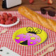 Paper plates with image of a colorful pink and yellow polka dot ladybug against a yellow background.