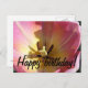 Birthday card, model "Pink and yellow tulip". Macro photo of a pink tulip with a yellow heart, and the text "Happy birthday!"
