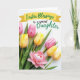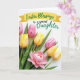 This card features a fresh spring bouquet set against a bright white background, with tulip buds in soft pink and sunny yellow arranged like close friends leaning toward one another 🌷. Deep green stems and wide leaves weave through the flowers, adding contrast and a gentle sense of movement. Near the bottom, one fuller pink bloom opens in layered petals, like a quiet centerpiece that draws attention without stealing the scene. Across the upper area, a golden banner stretches diagonally, giving the layout a cozy, together-at-last feeling 🐰. The greeting text sits inside the banner, with most words in green and a few accents in black, centered and easy to read. Soft, diffused lighting highlights the petal edges and gives the bouquet a tender, romantic glow, while a slight blur in the background keeps focus on the main flowers. The composition guides your eye from the clustered tulips up to the banner, with the richest pink flower anchoring the lower edge and the yellow buds brightening the top-left area.
