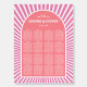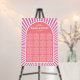 This beautiful wedding seating chart features a pink arch with burst sunrays in pink and white behind it, making it a truly groovy decoration. The names of the couple are written in a retro font, giving the seating chart a classic and timeless look. It is the perfect way to organise the seating of your guests, ensuring that all of your guests have a place to sit and enjoy your special day. This seating chart provides a unique and eye-catching element to your wedding decor, making it a memorable part of your wedding day.