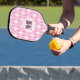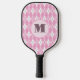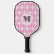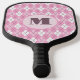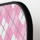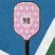 This custom pickleball paddle features white and pink argyle with a customizable monogram on a pink background. It's a stylish, cute gift for a woman who loves pickleball. It's a useful present for your mom, sister, grandma, or any woman who loves to stay active.