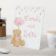 Cute pink baby shower CARDS AND GIFTS pedestal sign featuring a watercolor teddy bear with a pink bow and pink heart balloons and and a pink faux glitter star garland. OPTIONS: The sample is shown in an 8x10" size; other sizes are available. You can also transfer the design to a poster, paper flyer, banner, etc. or have the designer convert it to a DIGITAL DOWNLOAD file for printing locally. ASSISTANCE: For help with design modification or personalization, color change, resizing or transferring the design to another product or converting to a digital download file, contact the designer BEFORE ORDERING via the Zazzle Chat MESSAGE tab below or email makeitaboutyoustore@gmail.com.