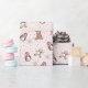 This gender neutral wrapping paper features an adorable hand-drawn pattern of winter stuffed animals (reindeer, teddy bears and penguins) among tiny yellow stars and snowflakes, all against a soft pink background. Perfect for baby's first christmas, winter baby shower, winter birthday, etc.