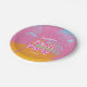 Pink "Bach Party" doll theme is a fun addition for a bachelorette party with the bride to be's name above in a script font and date below. The background is colorful with blue and yellow sky inspired by a California beach.