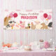 Celebrate your little one’s big day with this sweet farm animal birthday banner featuring a cheerful barnyard crew in party hats! With soft pink tones, festive balloons, and playful animals like a cow, pig, duck, and horse, it’s perfect for a toddler or baby girl’s birthday. Customize the name and display it behind the cake table, on a fence, or at the party entrance for a charming Old MacDonald–inspired celebration.
