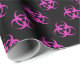Black gift wrap with a bright pink biohazard symbol pattern.