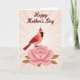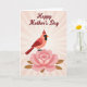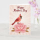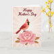 This card features a reddish-pink bird with a small crest and a dark face marking, perched calmly as if keeping gentle company with the flower beneath it ❤️. Its bright orange beak and attentive gaze add a tender, friendly tone to the scene, like a quiet moment shared in nature. The bird sits on a large blush-pink blossom with many layered petals that look soft and full. A few wide, earthy brown leaves spread out under the bloom, grounding the composition. The background is a creamy off-white with faint, pale pink rays fanning outward, giving the center a subtle glow. Near the top, a short greeting appears in deep crimson lettering, centered above the illustration and standing out clearly against the light backdrop 🌼. Thin white edging around the bird and flower helps the shapes stand apart from the softly radiating background. The pink rays form a gentle sunburst behind the bird and flower on the creamy background.