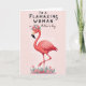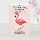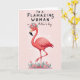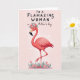 This card shows a coral-pink tropical bird standing on one slim leg, its long neck curving upward as it gazes with softly closed eyes and a calm, affectionate expression ❤️. A small crown of blush roses, tiny white blossoms, and leafy greens sits on its head, like a sweet nod to someone cherished. The background is a pale, rosy pink that keeps the scene gentle and dreamy, while the feathers are shaded in soft layers for a light sense of depth. Near the bottom, little pink flowers and stylized green leaves cluster together, suggesting a quiet garden moment shared in friendship. Across the upper area, the text reads “TO A FLAMAZING WOMAN” in a darker pink, with “on Mother’s day” placed just below in a smaller, matching tone 🌼. The words sit centered above the bird, leaving plenty of open space so the message feels airy rather than crowded. Tiny white speckles float around the bird against the soft pink backdrop, like faint confetti or drifting pollen.