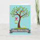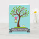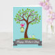 Designed with a stylized tree as the main focus, the card shows a sturdy brown trunk rising into a full canopy of green leaves dotted with soft pink touches. A pale blue background reads like open sky, giving the scene plenty of breathing room and a gentle, airy mood. Near the upper branches, a bright pink bird perches on a light green birdhouse, its wide eye and upright pose suggesting a proud, affectionate watchfulness ❤️. Down at the base of the tree, two smaller birds—one soft blue and one pale yellow-green—stand close together as if sharing a quiet moment of friendship. The yellow-green bird has a tiny heart-shaped feather crest, adding a sweet romantic cue without needing extra decoration 🌼. Along the bottom edge, a dark gray ribbon banner stretches across the width, and the message is set in white lettering centered on the banner. The birdhouse hangs from a branch above the trio, and the banner curves gently with tapered ends near the lower corners.