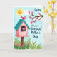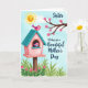 Designed with a spring garden scene, the illustration centers on a small birdhouse in soft pink with a teal roof, nestled among leafy green plants and clusters of pink blooms. A little bird in matching pink and blue peeks from the arched window as if sharing a secret with the viewer, while a second pink bird rests on the roof with a tender, watchful posture ❤️. In the upper left, a smiling sun glows gently, casting a cozy light that makes the flowers and foliage feel welcoming and close. Tiny white polka dots decorate the birdhouse, giving it extra detail without crowding the scene. Across the top, a slender branch stretches overhead, dotted with cherry blossoms that frame the birds like a gentle canopy 🌼. The sky behind everything is a soft blue with faint, airy clouds that keep the focus on the birdhouse and blossoms. Text sits near the top in a simple, dark tone, while a smaller line appears near the bottom in a lighter shade, and the birdhouse is covered in neat white polka dots.