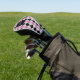 An old fashioned argyle pattern gets an update in pink, black, and silver gray on this unique and attractive golf head cover for her. At the center is a black circle banner which is lined in matching pink. On the banner is your two letter monogram in matching gray at the center.