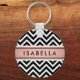Accessorize your keys in style with a chic modern round keychain. Design features a black and white chevron zig-zag pattern, pretty pink faux rose gold foil stripe, and your name or other customized text in a simple black typography font. This elegant and trendy accessory makes a stylish gift for her. Perfect as a bridal shower or bachelorette party favor, or as a bridesmaid gift idea.