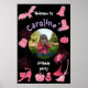Pink and black Birthday party welcome poster with illustrated Halloween motifs. In the center you can customize the poster with your baby's favorite and you can modify all the text that comes out. On the back a print with funny ghosts flying.
