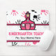 A kindergarten teacher mousepad featuring a background of pink and black handprints over white. Pink Schoolhouse logo at center. Text reads "KINDERGARTEN TEACHER." Personalize with your name. Look for matching items at The Pink Schoolhouse.