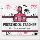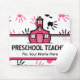 A preschool teacher mousepad featuring a background of pink and black handprints over white. Pink Schoolhouse logo at center. Text reads "PRESCHOOL TEACHER." Personalize with your name. Look for matching items at The Pink Schoolhouse.