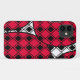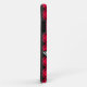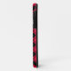 This phone case has a mid-century modern design of solid black diamonds inside black diamond outlines with pink blobs under them, all on a field of white.