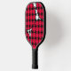 This pickleball paddle has a mid-century modern design of solid black diamonds inside black diamond outlines with pink blobs under them, all on a field of white.
