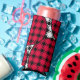 This seltzer can cooler has a mid-century modern design of solid black diamonds inside black diamond outlines with pink blobs under them, all on a field of white.