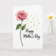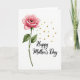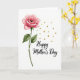 This card features a single pink flower on the left, its petals shading from soft blush at the edges into a deeper fuchsia near the center, as if glowing with watery paint. A slender curved stem and two green leaves with fine veins give it a gentle, living presence, like something offered with quiet affection ❤️. On the right side, scattered golden specks twinkle across the white space, creating the look of a light celebratory sprinkle drifting between two people. The message sits beneath those specks, aligned toward the lower right, written in a dark gray tone with flowing lettering that feels intimate and tender. The open white background keeps everything airy, letting the pinks and greens stand out while the gold adds a hint of sparkle. Small details in the petal folds and soft highlights suggest a careful, caring touch, like a note passed between close friends or sweethearts 🌼. The golden specks vary in size and spacing, tapering slightly as they trail upward across the right half of the card.