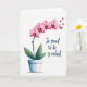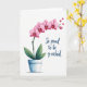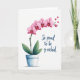 Designed with a soft watercolor look, this card features a flowering plant centered on a bright white background, giving the scene lots of airy space. A slender green stem rises from a light blue ceramic pot, like a small gift being offered with quiet affection ❤️. Along the stem, pink blossoms trail upward in gentle gradients from rosy pink to deeper magenta near the centers, with tiny golden touches that feel like warm compliments. At the base, broad green leaves spread out, grounding the bouquet the way steady friendship supports a sweet moment. Near the upper right of the plant, small red hearts float upward, as if two people are sending wordless care across the page. On the right side, deep blue lettering sits in a flowing, cursive style and reads, “So proud to be y-orchid,” balancing the artwork with a light, affectionate pun 🌼. The hearts appear as a rising diagonal trail from mid-right toward the top-right corner.