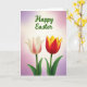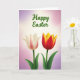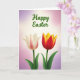 Designed with two spring flowers rising side by side, the artwork centers on slender green stems and leafy shapes that lean toward each other like close friends. The left bloom is creamy white with fine blush-pink lines across its petals, giving it a gentle, tender look. Next to it, a deeper red flower opens wide, edged with golden-yellow accents that feel like a warm, affectionate glow between the pair 🌷. Behind them, the background fades from warm cream at the top into a pale lavender-pink near the bottom, creating a soft, airy setting. Near the top, the greeting text sits above the flowers in a flowing green cursive style, spaced so it doesn’t crowd the petals 🐰. The lighting looks diffused, as if morning sun is filtering in, bringing out velvety petal texture and subtle shading along the leaves. The red petals show golden edging against the lavender-pink backdrop, while the green text remains centered above the blooms.