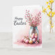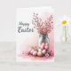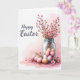 This design shows a clear glass jar holding a bouquet of slender green stems topped with many tiny pink blossoms, like a sweet spring surprise 🌷. Nestled at the base and partly inside the jar, smooth egg shapes are arranged close together, as if they’ve been gathered with care by a close friend. Their surfaces glow in pastel pink, soft gold, and creamy white, with a few gentle speckles that add texture without feeling busy. Behind the arrangement, a soft wash of pale pink fades into bright white, giving the scene an airy, tender backdrop. Light falls softly across the glass and petals, making the flowers look freshly set down and quietly admired. On the left side, the greeting text sits in a charcoal-gray cursive style, balanced and easy to read against the light background 🐰. A few loose petals and tiny blossoms are scattered around the bottom edge, with the jar’s rounded rim catching a small highlight.