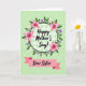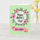 This greeting card features a circular wreath of green leaves dotted with pink blossoms, tiny white daisy-like flowers, and small violet clusters, arranged like a gentle hug around the center. Inside the wreath, the main text “Happy Mother’s Day!” sits in dark lettering on a bright white circle, giving it lots of breathing room and an easy-to-read focus ❤️. Behind that white circle, a light green check pattern peeks through, adding a cozy, homey touch without distracting from the message. The overall background is a soft pastel green with faint polka dots that feel light and airy, like a calm spring morning. A soft pink ribbon-style banner stretches across the lower area, carrying the words “Dear Sister” in matching dark text, placed neatly across the middle of the banner 🌼. The floral ring and the sister dedication together create a friendly, affectionate scene, like two close relatives sharing a quiet smile over fresh flowers. Four larger pink flowers with fanned petals sit around the wreath at balanced points, with smaller blooms filling the gaps between the leaves.