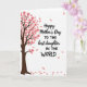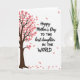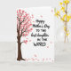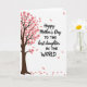 This card features a stylized deciduous tree along the left side, with a dark brown trunk and branching limbs that rise into a canopy of soft coral-pink, five-petaled blossoms. Against the white background, a few matching petals drift outward as if carried by a light breeze, adding gentle motion and a quiet, affectionate mood ❤️. On the right side, a short message is arranged in two contrasting type styles, with flowing black lettering paired with thicker, straightforward black text for emphasis. The words sit comfortably in the open space, leaving plenty of white area around them so the design feels airy and calm. The blossom-laden branches subtly point toward the text, like a tender gesture reaching across the card. A handful of petals appear both midair and lower on the page, creating a soft trail that guides the eye. The overall palette stays simple—dark brown, coral-pink, black, and white—with the petals scattered diagonally from left to right 🌼.