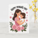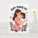 Designed with a gentle, affectionate scene, the card shows an adult woman with long dark hair in a soft pink outfit holding a smaller child with matching dark hair and a simple white top. Their eyes are closed as they lean into each other, and the slight blush on their cheeks suggests a tender closeness ❤️. The background is plain white, keeping the focus on their embrace and the calm, intimate mood. Along the bottom edge, a cluster of pink flowers and green leaves forms a natural border, adding a garden-like softness 🌼. Small pink star shapes are scattered lightly around the figures, giving the open space a sweet, dreamy touch. Near the top, a short greeting is centered above them in a rounded, friendly style, printed in a coordinating pink. The final detail is the floral border sitting at the base with layered pink petals and leafy green stems.