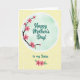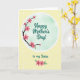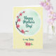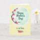 This design shows a soft pastel yellow background sprinkled with small white polka dots, creating a light, airy setting. A white-rimmed circular vignette sits in the center, filled with a gentle mint-green gradient that feels calm and caring ❤️. From the lower left of the circle, a dark branch reaches upward, dotted with bright pink five-petaled blossoms that seem to lean in as if sharing a quiet, affectionate moment. The main text, “Happy Mother’s Day!”, is placed inside the circle in dark teal flowing lettering, standing out clearly against the mint backdrop. Just below the circle, the smaller line “to my Sister” appears in the same dark teal style, centered and easy to spot. Near the bottom of the card, a second cluster of pink flowers and green leaves adds a sweet, sisterly touch 🌼. The front design shows the blossoms with darker pink centers and fresh green leaves gathered along the lower edge.