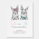 A cute gender reveal Welcome Sign featuring two adorable hand drawn black and white bunnies, a girl and a boy, at the top of the card, with "She or He" written below in pink, blue and gray hand lettered script and sans serif typography. Personalized with the party details below. Copyright Elegant Invites, all rights reserved.