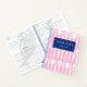 Pink recipe book printed with a cooking pattern with white kitchen utensils adorned with little hearts. Balloon whisks, knives, spatulas, and ladles. Personalize with your name in elegant retro letters. Recipe book is written in a charming script on a blue label against pink and white.