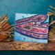 A small gold heart is surrounded by a pink heart inside a lavender purple heart on a soft blue background. Purple and navy outline the hearts. Glitter is color matched in pattern designs on top of the watercolor painting. This is a painting detail from Inspirational Word "Faith" artwork.