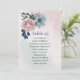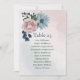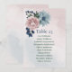 Beautiful botanical wedding seating chart card featuring pink, dusty blue and navy blue flowers with green leaves.