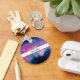 A keychain with a beautiful abstract design in pink and blue. White stars sprinkled throughout this image of the cosmos. Trippy and cool.