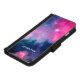 A phone case wallet with a beautiful abstract design in pink and blue. White stars sprinkled throughout this image of the cosmos. Trippy and cool.