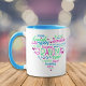 This cute mug for Grandma is appropriate for many occasions, including Mother's Day, Valentine's Day, her birthday, or just anytime you want her know how loved she is! Both sides feature a words that describe Grandma's loving nature and form a heart. Colors used include green, blue, and pink. Your own custom text is between the two word images. Bright and colorful!