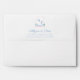 Return Address envelope design. The liner features a pale blue and white Greek Key pattern with a pink watercolor wedding crest decorated with blue hydrangeas. All watercolor elements originally handpainted by me before being scanned into digital form. The reverse flap has the name/ return address in blue, and a smaller version of the crest.