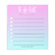 Modern and practical notepad that will help you get your days organized! This checklist has lines and circles where you can check them off as you get the tasks done. A big helper to get things done without procrastinating! The background is a beautiful pink and blue ombre color. Customize this product by adding your name at the bottom.