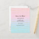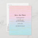 Save the date postcard with a cool abstract pattern. Pastel gradient in pink and blue colors with thin gold stripes. The gold stripes/lines are faux gold glitter.