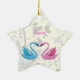 Pink blue swan love heart couple keepsake ornament, featuring a couple of swans, pink and turquoise blue, that form a love heart and above them a smaller heart, on ivory background with pale grey/gray leaves and reflections.