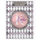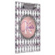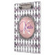 A stylish white and shimmery pink blush harlequin diamond pattern as a backdrop with a pink sphere in the middle with grey flourish for personalizing to make it uniquely your own. Elegant chic vibes.