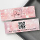 Mini earring display card with centered custom logo template and QR code on a light pink background with soft bokeh glitter lights. The earring guides can be adjusted by adding and removing spaces in the template field, and by moving the whole element in the design tool.