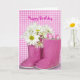 white daisy bouquet in pink boots on pink and white gingham background for birthday