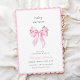 Celebrate the upcoming arrival of a sweet baby girl with this timeless and elegant baby shower invitation. Featuring a soft pink satin-style bow and graceful script typography, this design blends classic charm with modern minimalism. The clean white background allows the delicate details to shine, creating a refined look that’s perfect for a traditional, chic, or feminine baby shower theme.