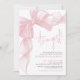 It’s A Girl! Baby Shower Invitation. This sweet and playful design features a soft blush pink watercolor bow with a ribbon frame accenting the top and left side, adding a charming and whimsical touch. The phrase “It’s A Girl!” is displayed at the top in elegant script, setting the tone for a joyful celebration.