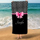 Personalized Pink Bow Black And White Polka Dots Name Beach Towel.