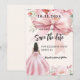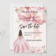An elegant cream, beige colored background, decorated with a large pink bow, pink flowers and a girl in a pink dress. Personalize and add a name and details.
