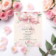 A soft cream, peach colored background, decorated with a pink large bow and, a golden cross and pink flowers. Personalize and add a name and details details.